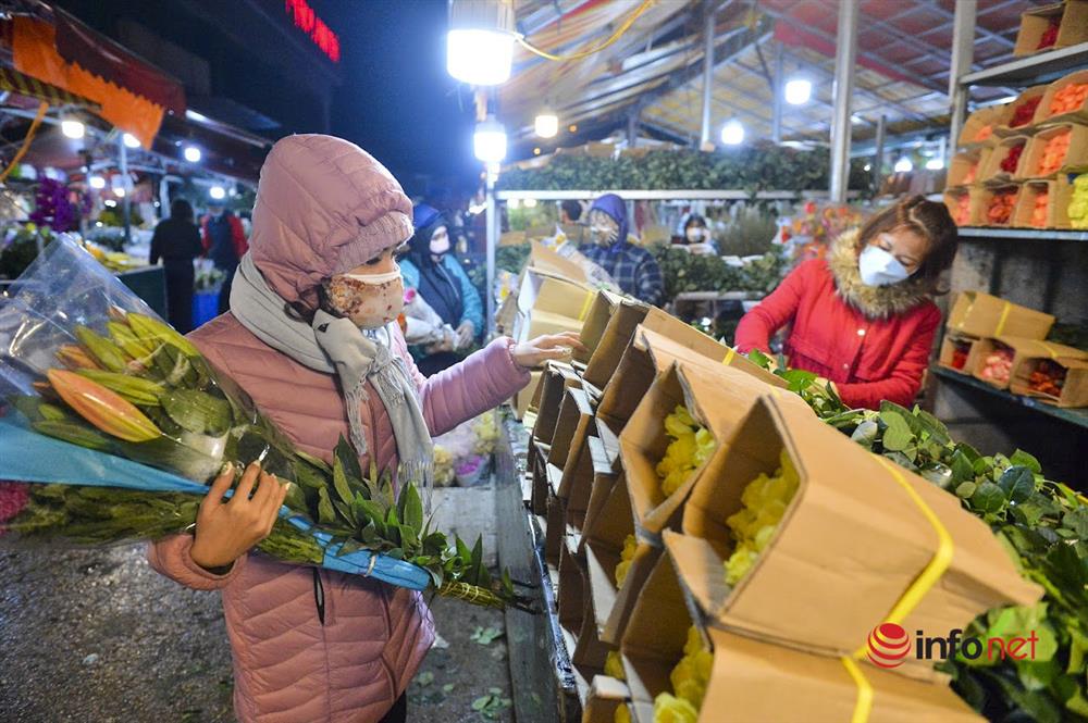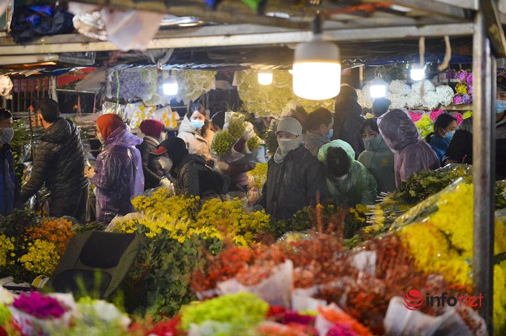 Thời tiết Hà Nội về đêm lạnh buốt kèm theo mưa phùn, chợ hoa vẫn nhộn nhịp không khí mua bán.