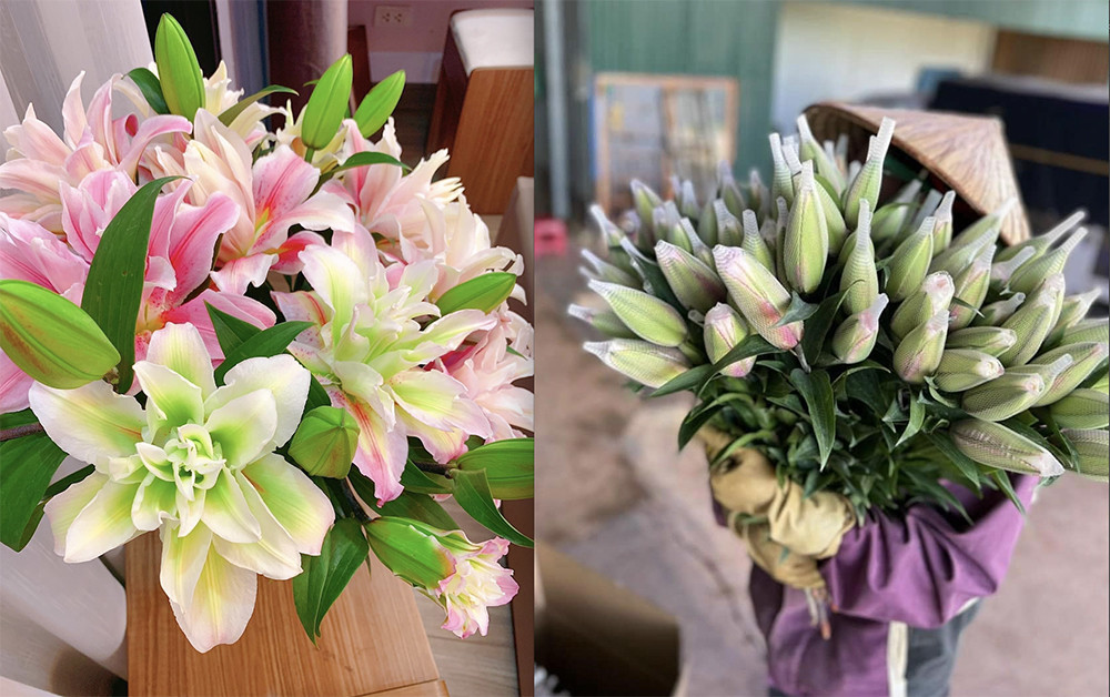 Sáng 27 Tết tranh thủ đặt mua bó hoa ly với yêu cầu cần giao gấp trong ngày để bày biện bàn thờ cúng Tất niên trước khi về quê, chị Nguyễn Bảo Ngân ở Mễ Trì (Nam Từ Liêm, Hà Nội) phải chi gần 1 triệu đồng cho 10 cành ly kép loại 5-7 tai (5-7 bông hoa một cành) và thêm 50.000 đồng tiền phí giao hàng “hoả tốc”.