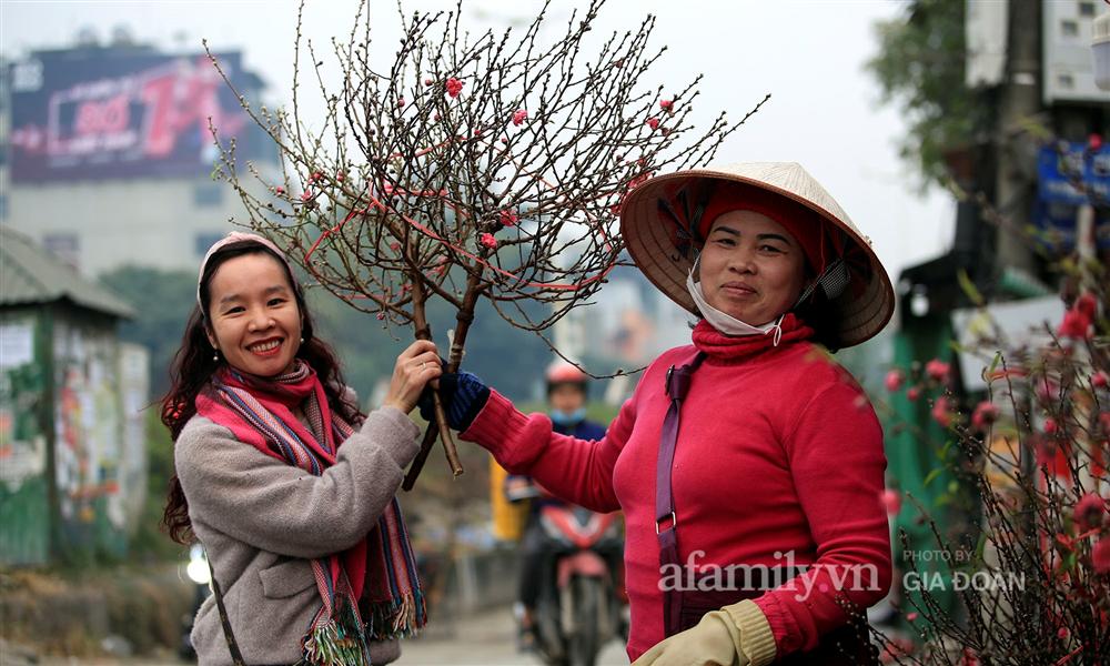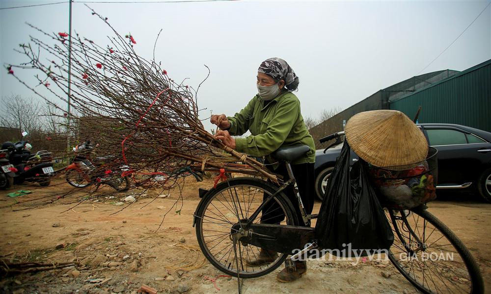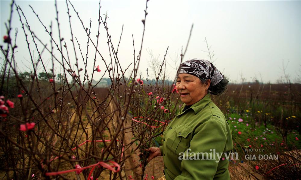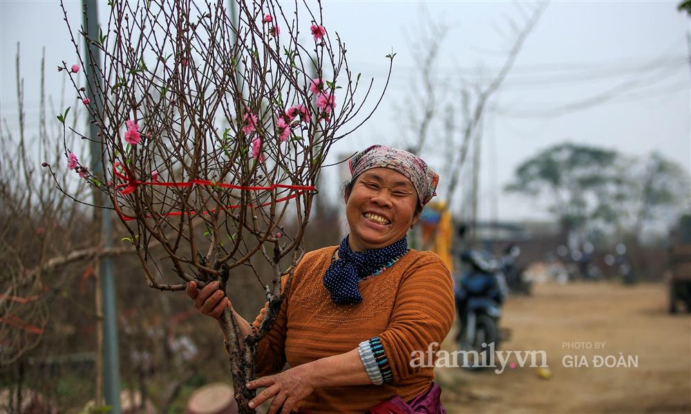 Bà Nguyễn Thị Vũ phấn khởi khi mang cành đào nào từ dưới vườn lên cũng tấp nập người mua. "Năm nay thế này là bánh chưng có thịt rồi", bà Vũ hài hước chia sẻ.