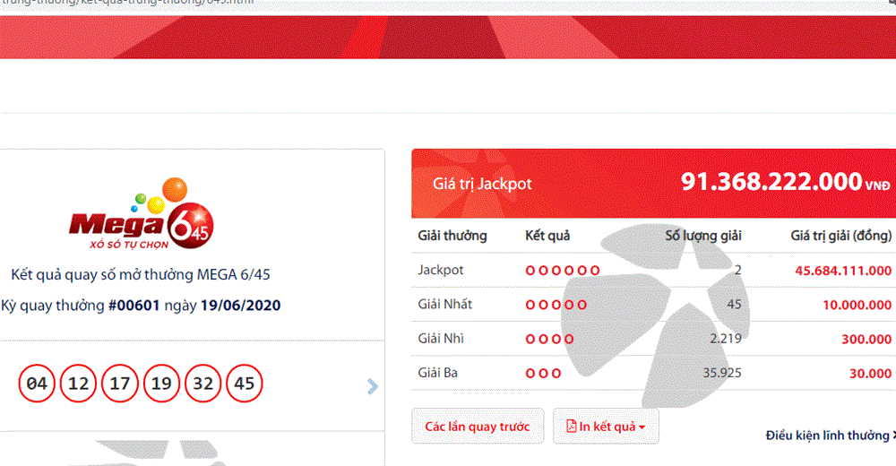 Trong kỳ quay số mở thưởng lần thứ 601 của loại hình xổ số tự chọn Mega 6/45, ngoài 2 giải độc đắc trị giá hơn 45 tỷ đồng, Hội đồng quay thưởng còn tìm được ra 45 giải nhất mỗi giải trị giá 10 triệu đồng, 2.219 giải nhì mỗi giải trị giá 300.000 đồng và 35.925 giải ba mỗi giải trị giá 30.000 đồng.
