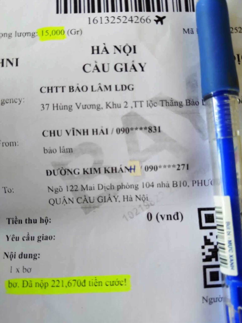 Thế nhưng, chưa kịp vui vì nhiều đơn hàng, anh Chu Vĩnh đã "điếng người" khi ra đến bưu điện, anh được thông tin giá cước lên tới 14.000 đồng/kg, chuyển 15kg bơ mà phí chuyển đã lên tới 221.670 đồng.