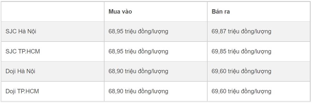 Doji Hà Nội: 68,9 triệu đồng/lượng (mua vào) -69,6 triệu đồng/lượng (bán ra)