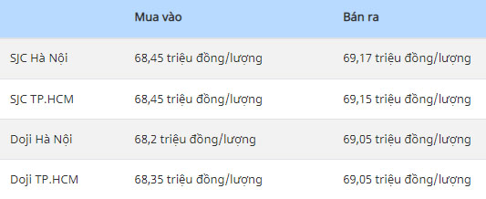 SJC TP.HCM: 68,20 triệu đồng/lượng - 68,90 triệu đồng/lượng
