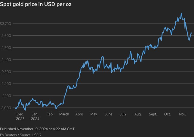 Trong phiên giao dịch ngày 19/11, giá vàng giao ngay tăng 0,4% lên 2.621,95 USD/ounce, mức cao nhất kể từ ngày 12/11. Giá vàng tương lai của Mỹ tăng 0,5% lên 2.626,30 USD.