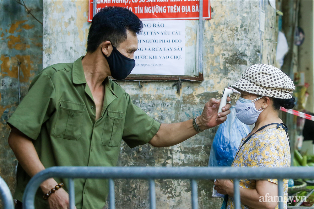 Lực lượng chức năng kiểm soát người dân ra vào chợ, đo thân nhiệt, khử khuẩn tay trước khi vào đi chợ.