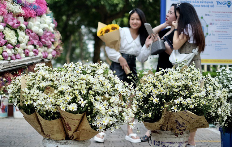 Nhiều bạn trẻ thích thú tạo dáng chụp ảnh bên những hàng hoa bán cúc hoạ mi.