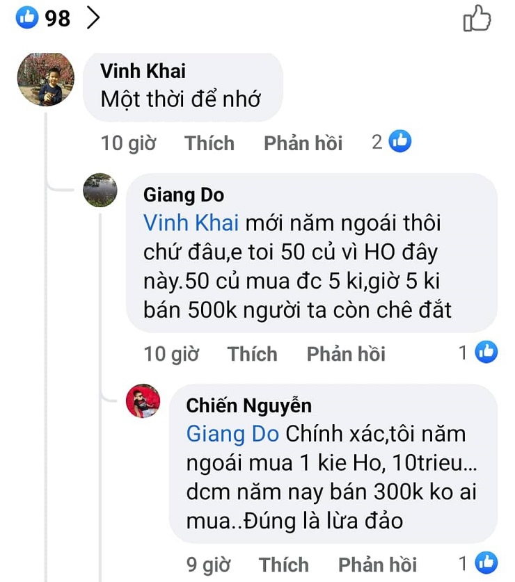 Một tài khoản khác tên Lam B. S. cũng chia sẻ: “Chính xác rồi, tôi năm ngoái mua 10 triệu/1 kie HO, nhưng giờ đây 300 ngàn không có ai hỏi han. Nhà vườn từng bán HO cho tôi, giờ đây cũng đang ôm lỗ sấp mặt”.