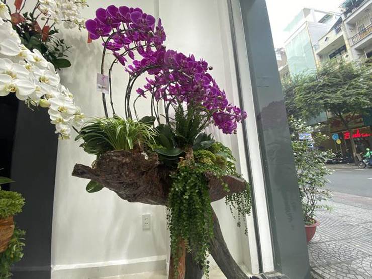 Điểm đặc biệt năm nay ở TP HCM có loại lan hồ điệp được thiết kế trồng trên gỗ lũa (gốc, rễ cây) khá độc đáo. Khách có thể chọn thiết kế sẵn hoặc chọn những lũa ưng ý theo sở thích.