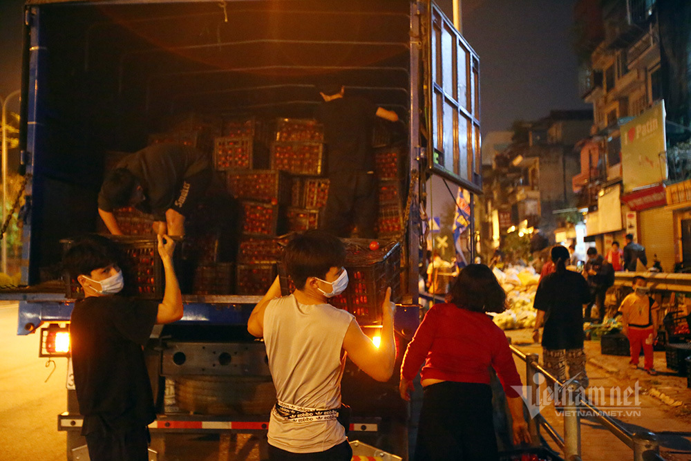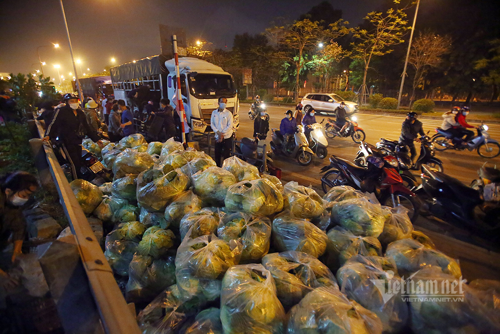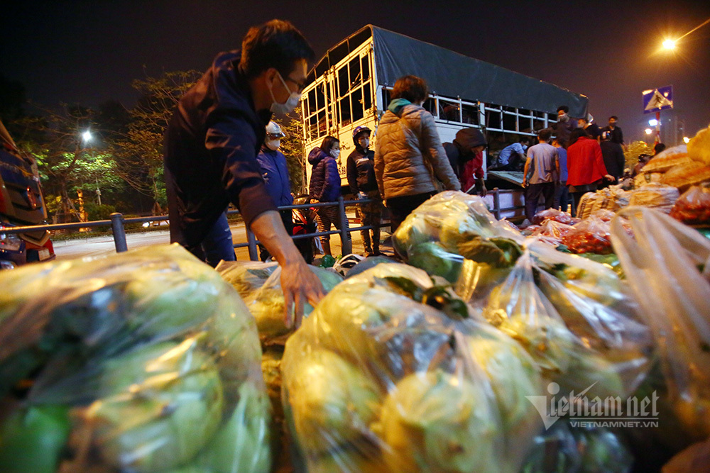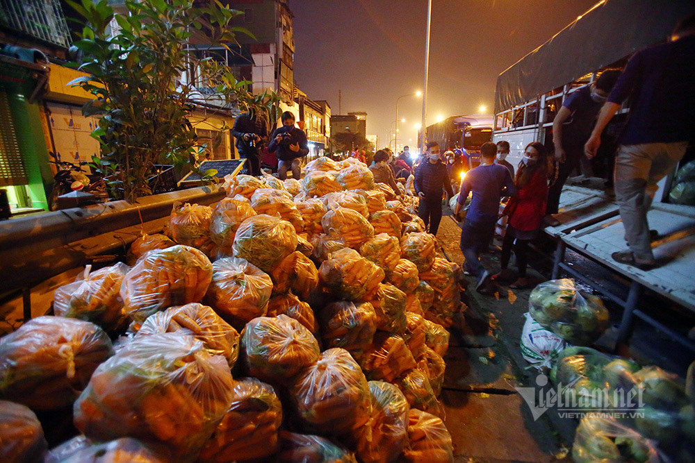 Hôm qua có 6 xe tải chở được 40 tấn rau các loại từ Hải Dương lên. Đến điểm tập kết ở Quế Võ (Bắc Ninh) thì dừng lại để chuyển hàng sang xe Hà Nội đảm bảo phòng dịch bệnh Covid-19. Các xe rau về đến Giải Phóng từ đêm qua, chị cho bốc hàng xuống bán luôn, bởi lượng hàng lớn không thể chất đống trên vỉa hè ảnh hưởng tới giao thông trên đường.