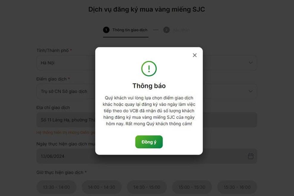 Chị Ngọc Thanh ở TP Thủ Đức (TP.HCM) cho biết chị đăng nhập website của Vietcombank mua vàng lúc 14h15 ngày 12/6. Sau khi điền đầy đủ các thông tin gồm tên, số điện thoại, CCCD và địa chỉ thì nhận thông báo ngân hàng đã nhận đủ số lượng khách đăng ký và đề nghị chọn điểm giao dịch khác.