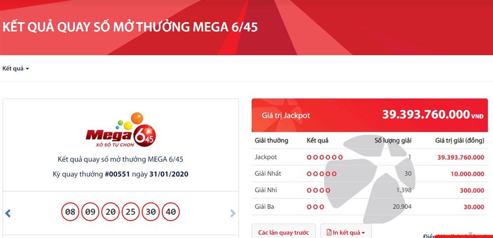 Cụ thể, trong kỳ quay số mở thưởng lần thứ 551 của loại hình xổ số tự chọn Mega 6/45 của Công ty Xổ số điện toán Việt Nam (Vietlott) diễn ra vào tối 31/1, Hội đồng mở thưởng đã xác định có 01 tấm vé trúng giải Jackpot trị giá 39.393.760.000 đồng.