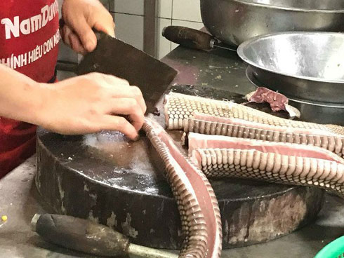 Anh Ngôn nói thêm, khoảng 10 ngày anh cho rắn ăn và thay nước một lần. Thức ăn của rắn là cá trê con. Trung bình 1kg cá trê nhỏ có giá khoảng 70.000 đồng, 10 ngày thì đàn rắn của anh Ngôn ăn hết khoảng 30kg cá trê.