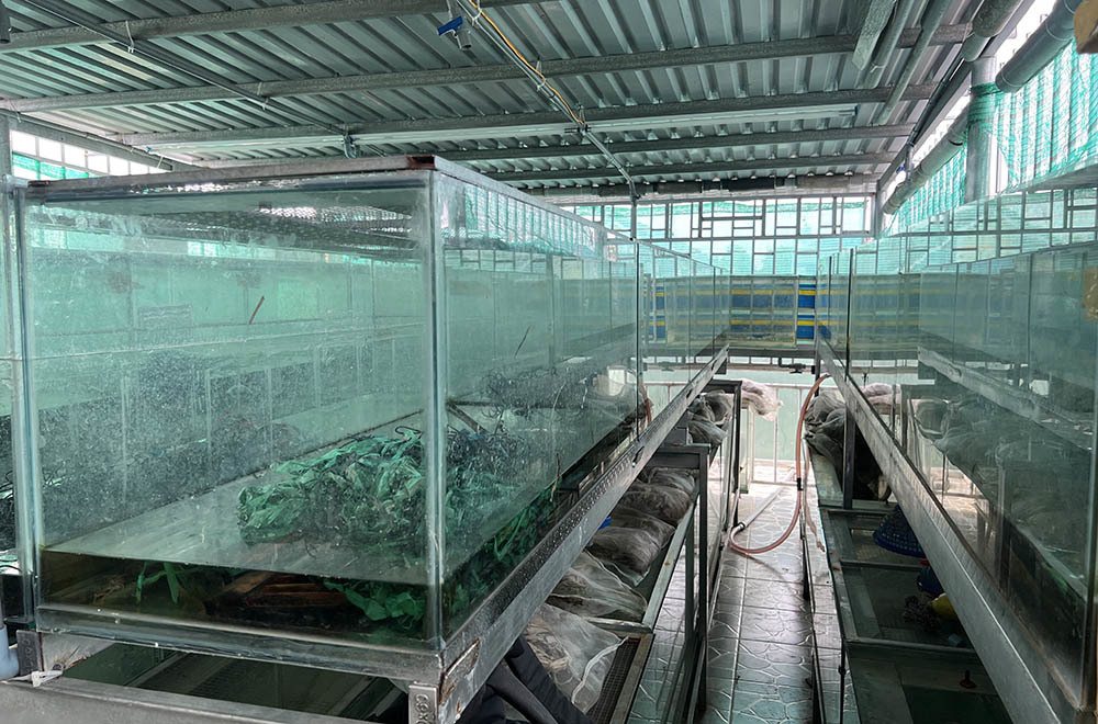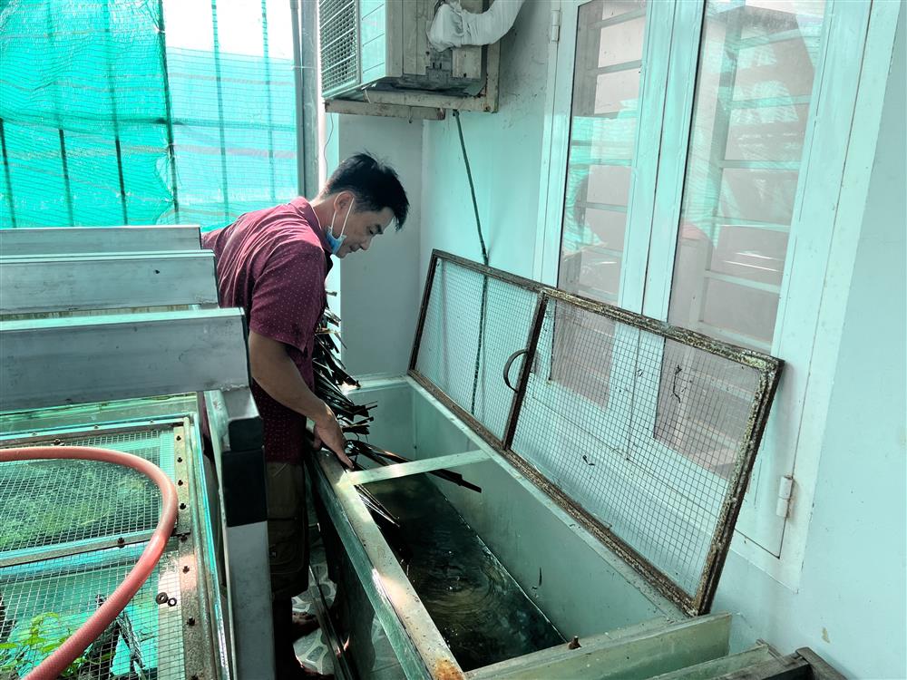“Mỗi tủ kiếng, nếu rắn lớn tôi thả 5 con (3 cái, 2 đực), rắn nhỏ có thể thả nhiều hơn. Nuôi trong tủ kiếng dễ theo dõi được rắn sinh hoạt, cho ăn; quan sát chất lượng nước, quá trình sinh sản của rắn. Trong tủ kiếng tôi để dây nilon, tàu lá dừa để rắn trốn bên dưới. Ngoài ra, tôi lót thêm lá chuối khô để lấy mùi”, anh Ngôn cho hay.
