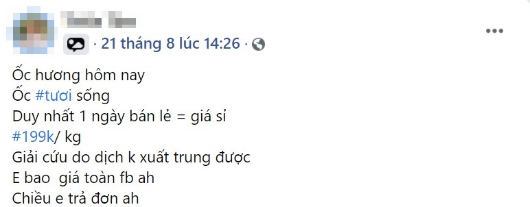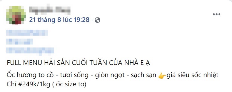 Ốc size to trước dịch giá bán tới 400.000 đồng/kg giờ giảm siêu sốc còn 249k/kg. Ảnh chụp màn hình.