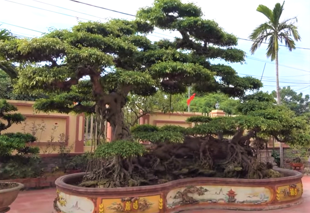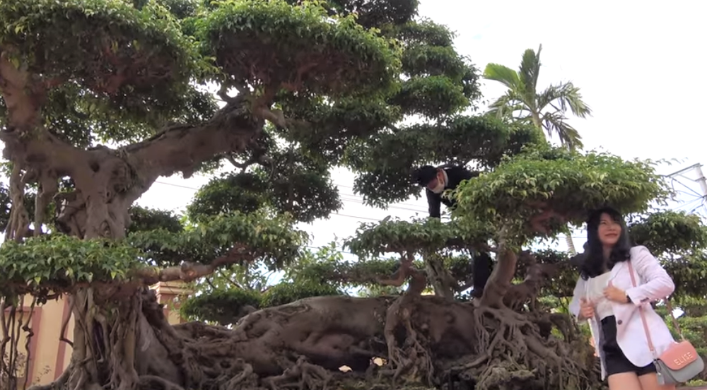 Trong video giới thiệu, cây sanh già có kích thước "khủng", ước tính chiều cao trên 3m, thân rộng đủ chỗ cho nhiều người ngồi, tán cây được cắt tỉa đẹp mắt.