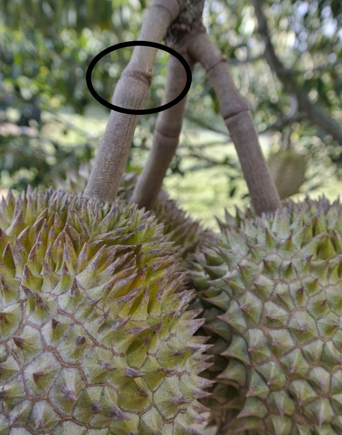Những quả sầu riêng chín rụng thì phần "đĩa" này sẽ tách khỏi cây, không phải là vết cắt.