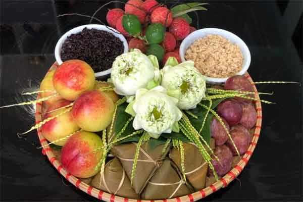 Đây cũng là dịp để các gia đình tưởng nhớ tổ tiên, tạ ơn thần linh, trời đất. Vì vậy, trên mâm cúng thường có các vật phẩm như mận, vải, chè, cơm rượu, bánh gio… Ở một số nơi lại không thể thiếu thịt vịt, bánh ú, chè kê, chè trôi nước…