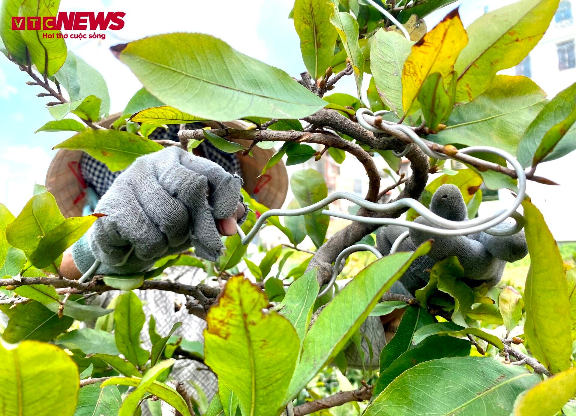 Việc tháo dây nhôm uốn định hình cây mai đòi hỏi sự khéo léo, vì nếu không cẩn thận, mai dễ rụng nụ và gãy cành.