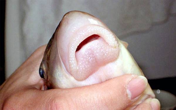 Mồm là đặc điểm nhận dạng đặc biệt và khác biệt nhất của loài cá anh vũ: mồm rất dày, trề ra và quặp xuống dưới, môi trên dày, môi dưới hình tam giác cũng khá dày, bên ngoài môi được bao phủ bởi một lớp trông như xúc tu bạch tuộc, với nhiều gai thịt tròn nổi.