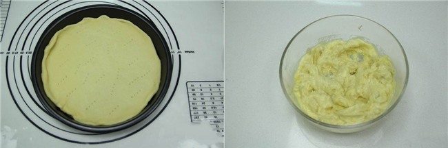 Cán từng khối bột thành tấm tròn rồi cho vào khay làm bánh pizza. Dùng dĩa để tạo các lỗ trên bề mặt bánh. Sầu riêng tách lấy phần thịt, dùng thìa nghiền nát.