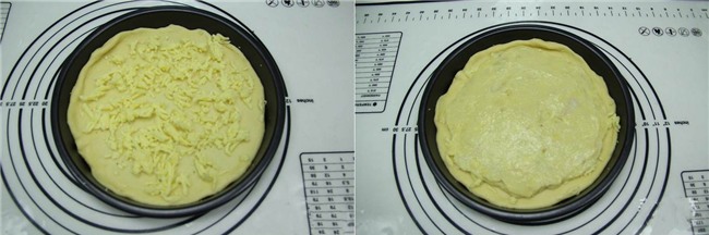 Cho một lớp mỏng phô mai lên đế bánh pizza vừa làm. Tiếp đó thêm sầu riêng đã nghiền nát.