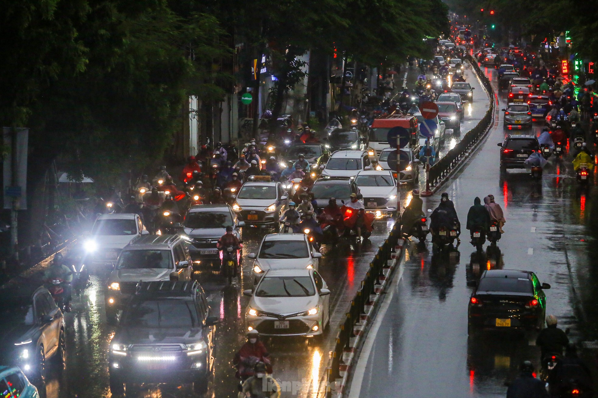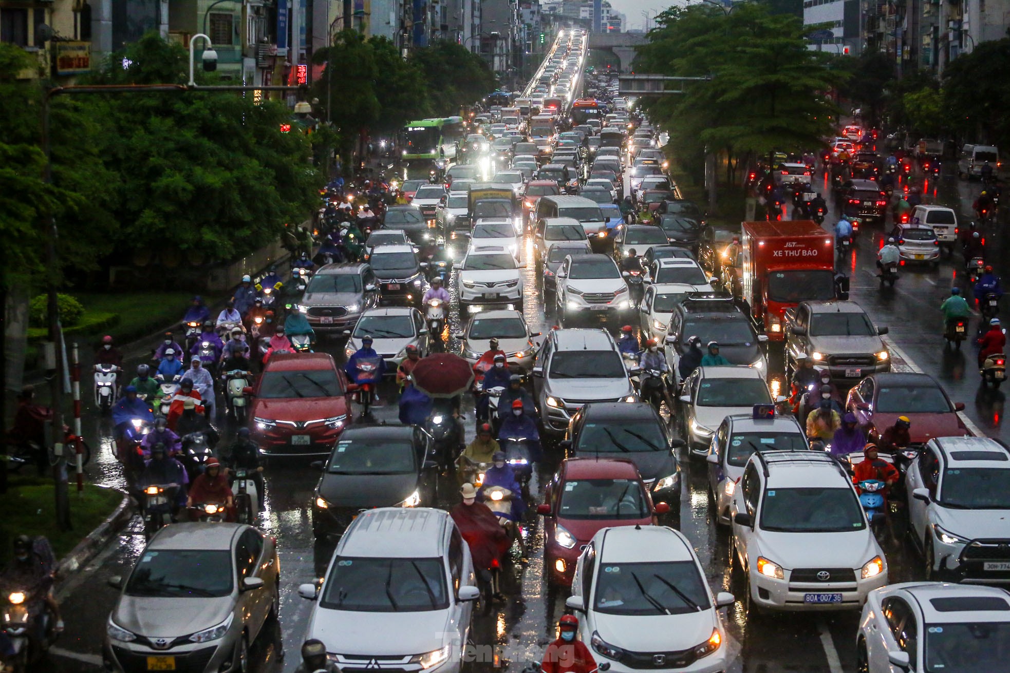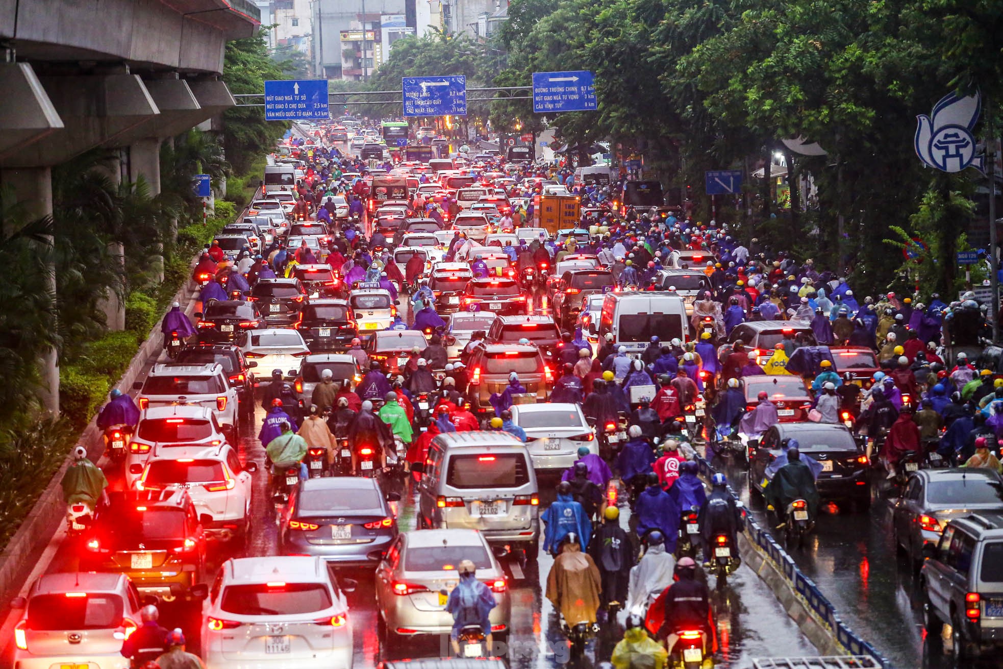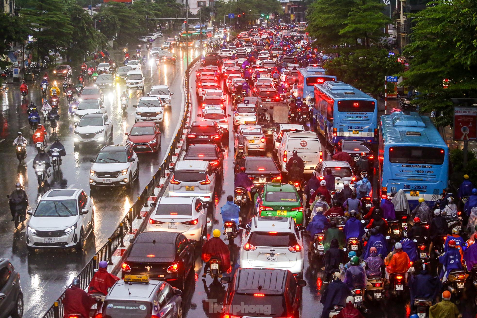 Hình ảnh tuyến đường Nguyễn Trãi ùn tắc kéo dài trong cơn mưa lớn.