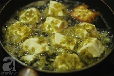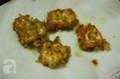 ![]() | ![]() Đun sôi dầu, thả từng miếng đậu phụ tẩm cốm vào chiên vàng. |