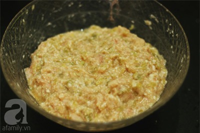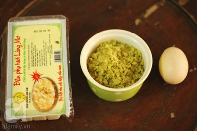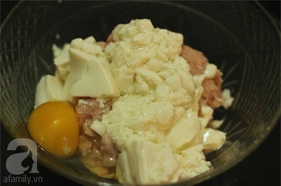 ![]() | ![]() Cho thịt, trứng, đậu phụ, gia vị vào tô, đậu nghiền mịn. Trộn đều hỗn hợp. |
