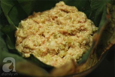 ![]() | ![]() Chuẩn bị lá sen, rửa sạch, lau khô. Trút phần thịt ở trên vào trong lòng lá sen. |