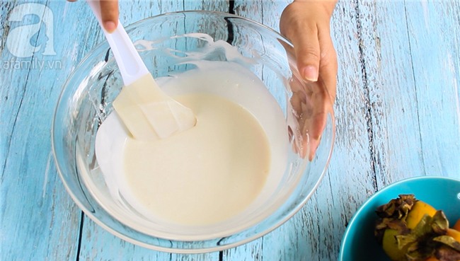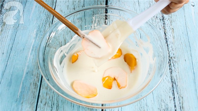 Làm nóng dầu trong chảo. Cho hồng vào tô bột, lăn hồng sao cho bột bám đều lên toàn bộ miếng hồng.