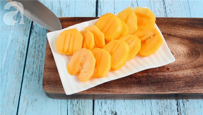 Gọt vỏ quả hồng, cắt 3-4 miếng. Cắt bỏ ruột trắng ở giữa để tránh hồng bị chát.