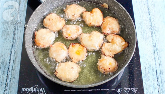 Lưu ý: nếu bạn muốn ăn lớp bột giòn cứng hơn, sau khi chiên hơi chín vớt ra nhúng thêm một lớp bột rồi chiên lần 2 cho đến khi vàng.