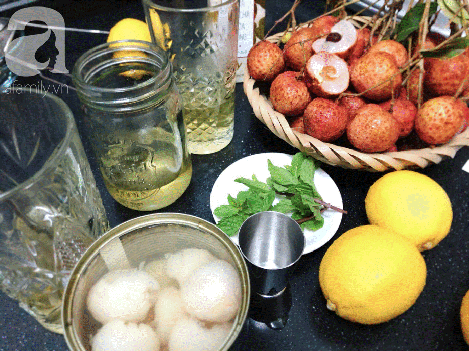 Cho vào mỗi ly 100ml trà hoa hồng và 50ml nước trái vải hộp.