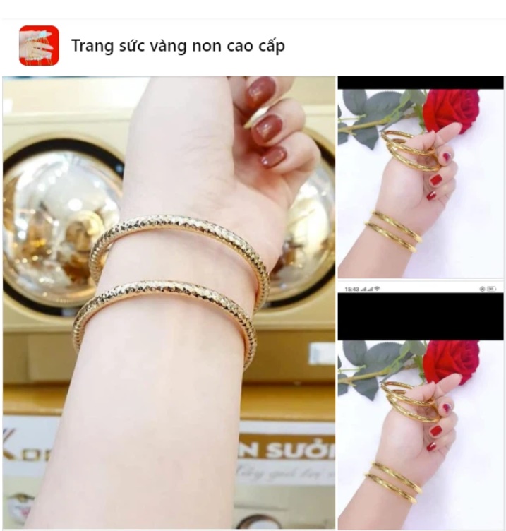 Ở một group có tên gọi “trang sức vàng non cao cấp” với hơn 10.000 thành viên theo dõi, các loại vòng cổ, nhẫn, khuyên tai có giá từ 200.000-700.000 đồng được quảng cáo rầm rộ.