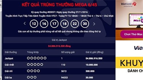 Công ty Xổ số điện toán Việt Nam (Vietlott) vừa cho biết thông tin trên khi công bố giải Jackpot kỳ quay số mở thưởng thứ 57 sáng nay, 28/11. Chiếc vé số giải Jackpot lần thứ 5 liên tiếp này có dãy số 12-16-17-18-22-30, trị giá 54.886.916.500 đồng.