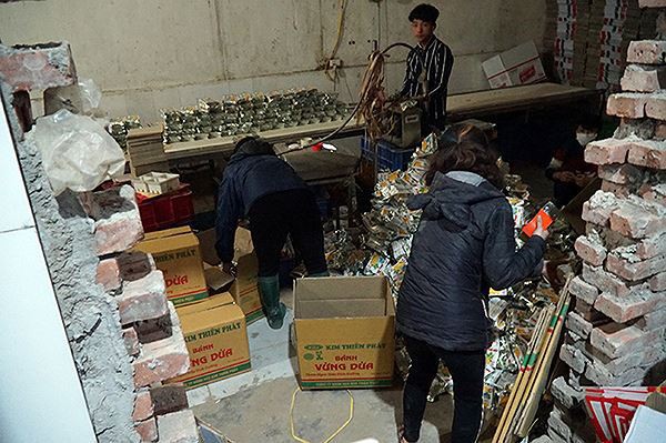 Tại buổi kiểm tra, lực lượng chức năng phát hiện dây chuyển sản xuất bánh kẹo tại cơ sở này không đảm bảo vệ sinh, sử dụng nhiều nguyên liệu không rõ nguồn gốc xuất sứ và làm nhái nhiều nhãn mác các thương hiệu bánh kẹo nổi tiếng.