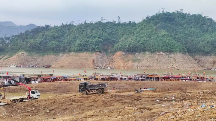 Tại khu vực cảng Bích Hạ, xã Thung Nai, huyện Cao Phong (Hòa Bình) vắng vẻ du khách do mực nước xuống thấp. (Ảnh: Đặng Tình)