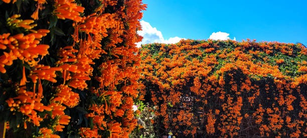Chùm ớt nở hoa thành từng chùm rủ xuống, màu đỏ cam rực rỡ, không chỉ giống trái ớt mà còn giống pháo hoa nở rộ, vô cùng rực rỡ và bắt mắt.