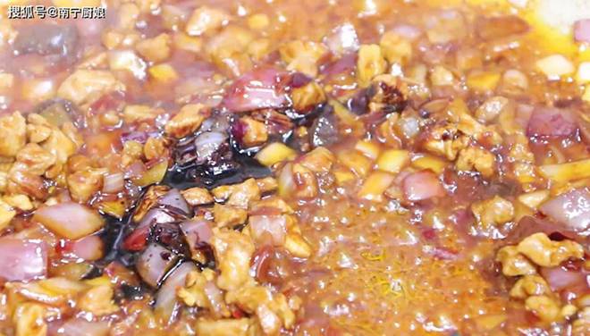Cho một lượng dầu ăn thích hợp vào chảo, cho hành tây vào xào trước cho thơm, thêm thịt heo vào sau, rưới 1 thìa nước tương và chút muối.