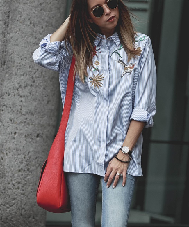 Nếu ngại ngần với những họa tiết cầu kì hay chữ in trên áo khiến bạn khó có thể mặc tới công sở, thì những chi tiết nhẹ nhàng thêu lên áo sơmi sẽ giúp trang phục của bạn không hề nhàm chán mà vẫn lịch sự khi đi làm.