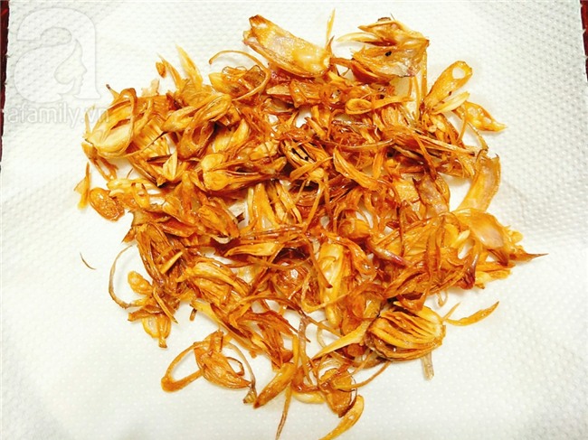 Hành khô thái lát mỏng rồi đem phơi khoảng 1 tiếng cho hành hơi héo rồi mới đem chiên cho hành vàng giòn là vớt ra đĩa có lót giấy thấm dầu.