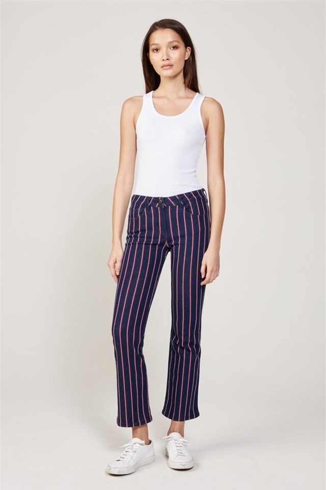 Kiểu quần có họa tiết kẻ sọc làm bạn cao lên và thon gọn hơn hẳn. Với quần jeans kẻ sọc bạn chỉ cần kết hợp cùng áo thun hay áo sát nách và giày sneaker.
