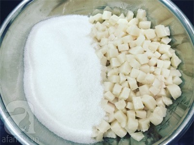 ![]() | ![]() Sau đó cho mỡ đã thái hạt lựu và đường vào tô lớn. |