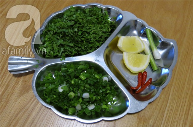 Hành lá, ngò, giá, chanh ớt, rửa sạch và cho vào khay đựng sẵn.