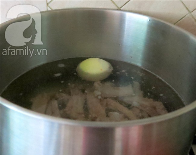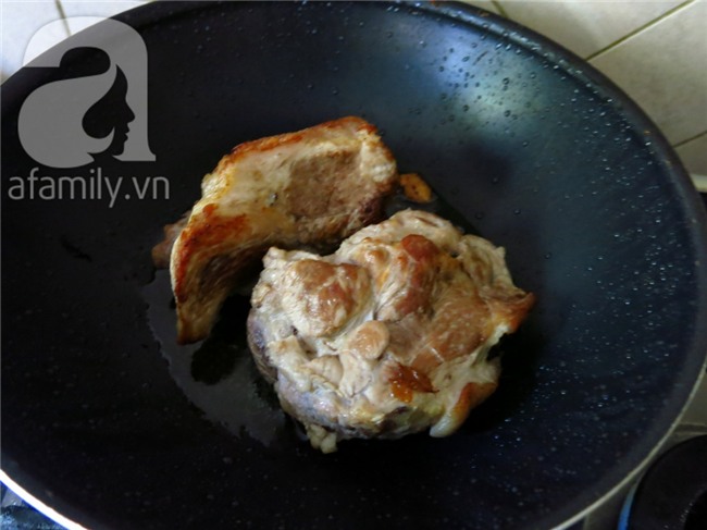 Bỏ dầu vào chảo, đập dập 1 tép tỏi và bỏ 2 phần thịt vào chiên đều khắp cho cục thịt cho thơm dầu, tỏi. Làm như vậy thịt thơm ngon hơn là thịt luộc ra rồi cắt bỏ vào tô.