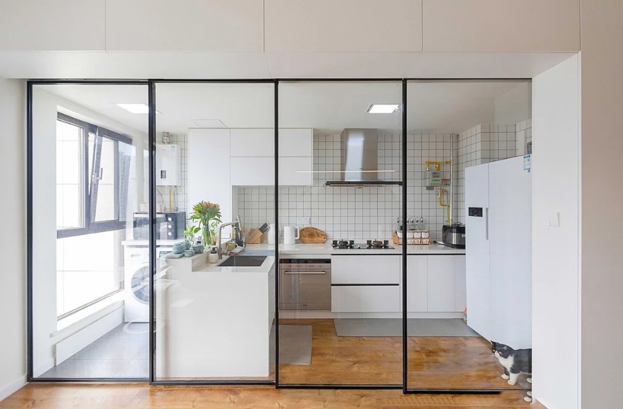 Ngoài ra, đối với vấn đề khí đốt, trên cơ sở bếp mở có thể sử dụng kính trượt một cách linh hoạt, giữa phòng ăn và bếp lắp đặt cửa kính trượt để giữ hai không gian độc lập, nhưng phải chú ý bảo dưỡng và thông gió khi sử dụng gas.
