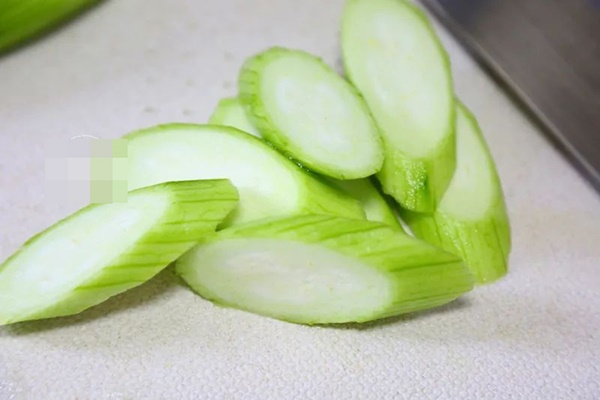 5. Gọt mướp rồi dùng dao cắt thành từng khoanh dày như trong hình.