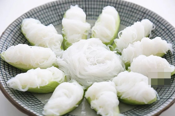 6. Bạn chọn một chiếc đĩa lớn hơn, cho mướp vào đĩa, sau đó cho bún khô lên trên.