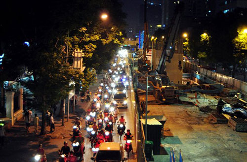 Công trường thi công đường sắt trên cao tuyến Cát Linh - Hà Đông nằm trên đường Nguyễn Trãi (quận Thanh Xuân) chiếm quá nửa lòng đường