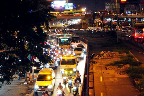 Các phương tiện nối đuôi nhau dài hàng cây số. Vào những ngày trời mưa, hàng ngàn người phải chôn chân trong mưa lạnh.